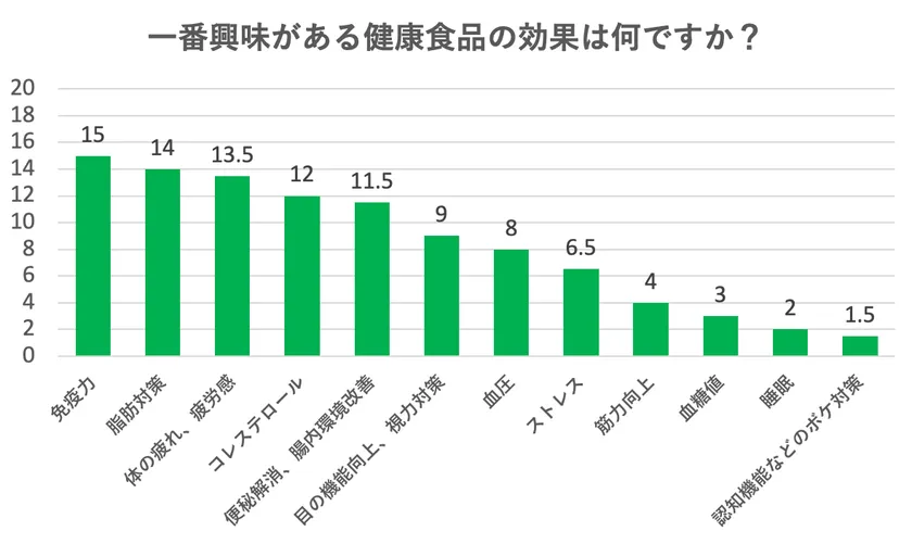 免疫力、脂肪対策、体の疲れ・疲労感・・・の順に関心度が高いことが分かりました。