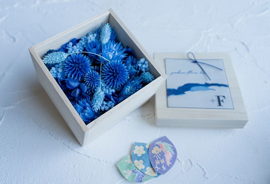 開発のきっかけは「四十九日にお線香をあげにいけない代わりに、ギフトを贈りたい」というオーダーでした、暑い時期ですと生花を贈る際あまり日持ちをしませんので、お贈りしやすいお供えとして品の良い桐の小箱へドライフラワーを厳選し詰め込みました。