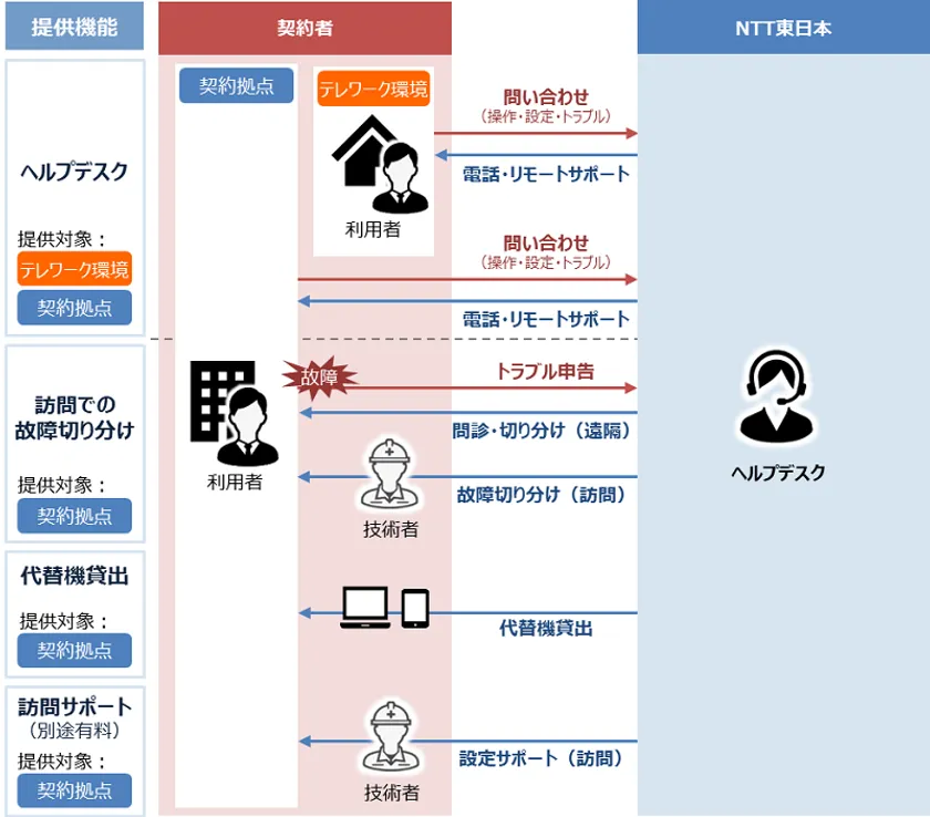 ※4 訪問での故障切り分け、代替機貸出および訪問サポートは、契約拠点に対してのみ提供いたします。また、お客さま建物内へ入室できないことによりサービスを提供できない場合があるため、お客さまの立ち合いを要する場合があります。なお、故障箇所の特定後の故障対応については、別途料金が発生したします。