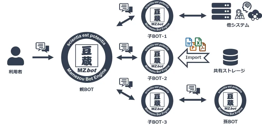 豆蔵が提供する対話型AIエンジン『MZbot』において本拡張機能を適用することで、質問を受け付けたBOT(親BOT)から、配下のBOT(子BOT)へ多段的(階層的)に問合せを行い、当該質問の回答候補を持つBOTを利用者へ案内することや、配下のBOTからの回答候補を集約して利用者へ返すことが可能となります。