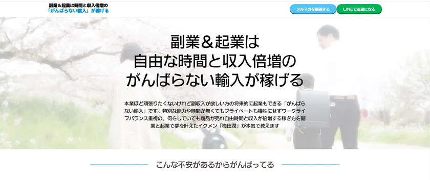 「個人輸入・ネット販売」の副業から起業を実現させた当社代表の梅田 潤が提唱する、会社員を続けながら1日たった30分の作業で、本業もプライベートも充実させつつ、面倒なことはできるだけ避けてゆるく稼げるようになる方法「がんばらない輸入」の認知度を向上させるサイトを実現します。