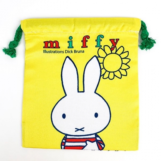 ミッフィー総柄の巾着です。ボーダー柄の洋服を着たミッフィーがかわいい♪