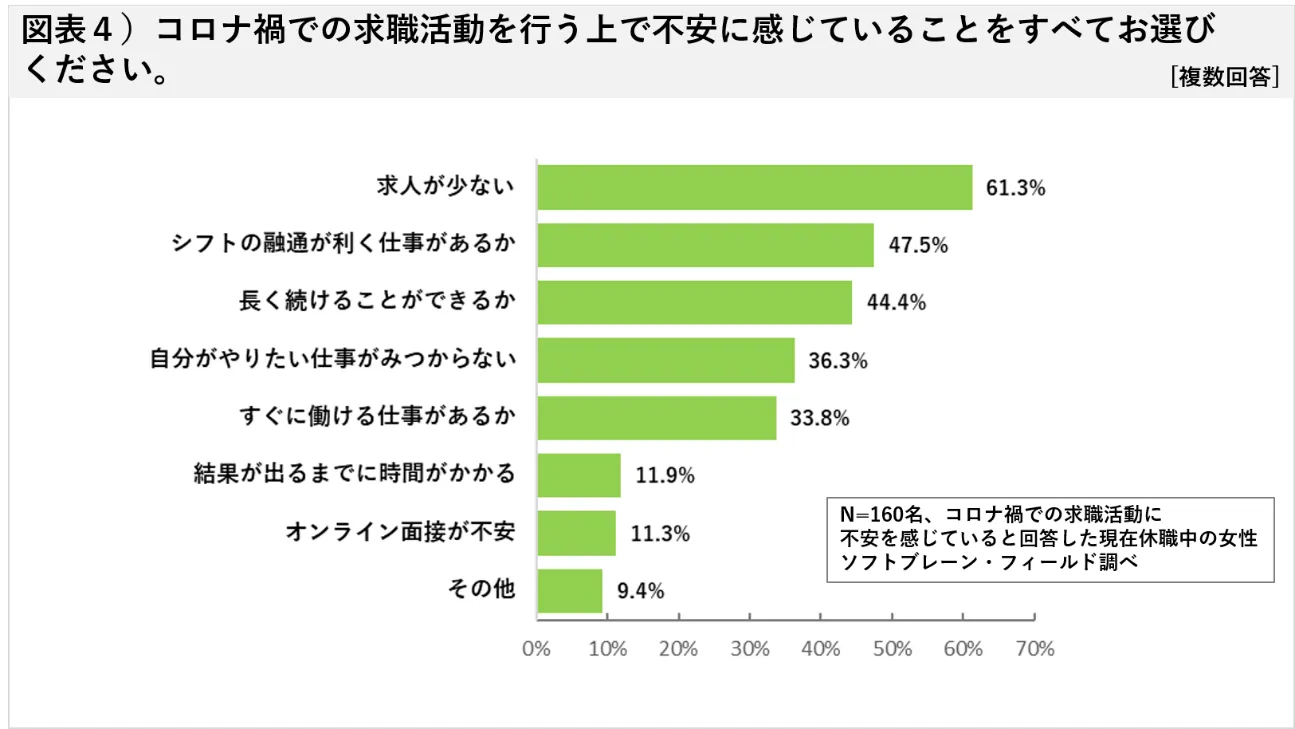 他にも、4月から5月にかけての緊急事態宣言による業務の自粛や休業要請などの経験による不安から、「シフトの融通が利く仕事があるかどうか(47.5%)」や「長く続けることができるか(44.4%)」が4割を超え、「自分がやりたい仕事がみつかるか(36.3%)」、「すぐに働ける仕事があるか(33.8%)」よりも割合が高くなっていました。