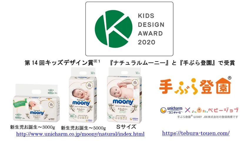 第14回キッズデザイン賞※1 「子どもたちを産み育てやすいデザイン部門」で 商品とサービスが高く評価 『ナチュラルムーニー』と『手ぶら登園』で受賞 2020年8月21日 NPO法人キッズデザイン協議会 公式サイトで発表