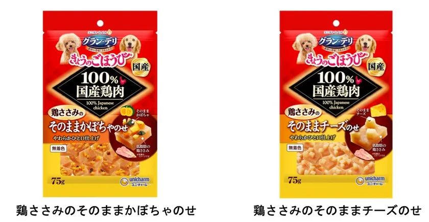 ユニ・チャーム株式会社(本社:東京都港区、代表取締役 社長執行役員:高原豪久)は、ご好評をいただいているジャーキータイプの犬用おやつ『グラン・デリきょうのごほうび』シリーズより、100%国産鶏肉を使用した生地に、かぼちゃやチーズをトッピングした『グラン・デリきょうのごほうび 鶏ささみのそのままかぼちゃのせ・そのままチーズのせ』を、2020年9月14日に全国で新発売します。