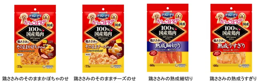 『グラン・デリきょうのごほうび』シリーズのパッケージのデザインを、100%国産鶏肉を使用し、安心して与えられるおやつであることがより伝わりやすいように改良し、発売します。