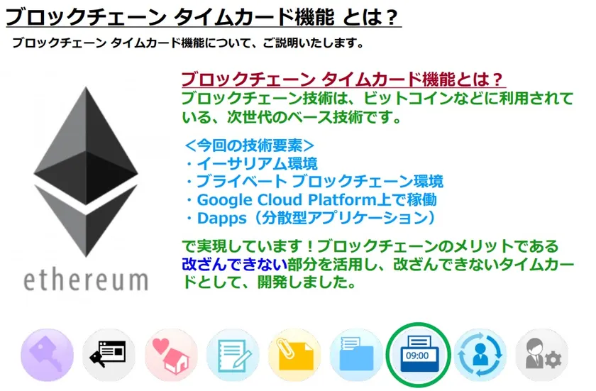 ブロックチェーン技術は、ビットコインなどに利用されている、次世代の基盤技術です。サテライトオフィス・ブロックチェーンタイムカード機能は、ブロックチェーンの特長である改ざん耐性を活用し、改ざんできないタイムカードとして開発しました。また、技術要素としては、イーサリアム環境、ブライベート ブロックチェーン環境、Google Cloud Platform、DApps(分散型アプリケーション)を利用し、実現しました。