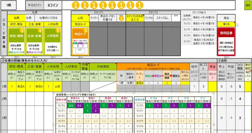 1グループ4~6人がライバル同士となって自分の会社を経営します。経営になじみのない人でも夢中になってプレイでき、市場や競合への対応、経営資源を蓄積する意味、お金の動きなどを体感的に学びながら、戦略思考を身につけられます。