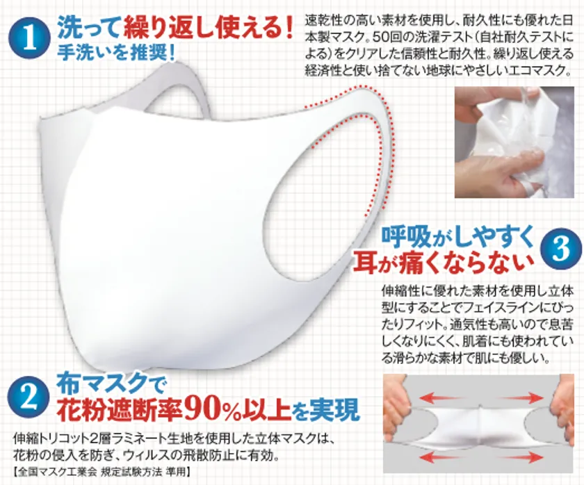 (1)洗って繰り返し使える (2)花粉遮断率90%以上を実現 (3)呼吸がしやすく耳が痛くならない