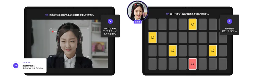 inAIRは、オンライン上で面接とコンピテンシー検査を受けるサービスです。応募者は時間と場所を問わず企業側が伝えたURLにアクセスし、名前と認証コードを入力のみで受検できます。専用アプリのインストールやアカウントを作成する必要はございません。応募者はinAIRを通し面接とコンピテンシー検査を受けることになりますが、面接の場合、準備時間と答え時間がそれぞれ設けられているので与えられた質問に対して自分の考えをまとめた後、答えていただけるようになっています。ゲームの場合はガイドに従って定められた時間内に問題を解いていただきます。採用担当者は応募者の受検が完了すると同時に自社専用の管理者サイトで分析結果レポート及び動画を確認することができます。レポートでは、面接と適性検査の結果を総合的に判断し、自己肯定や成長欲求など37の行動特性ごとに点数が算出されます。