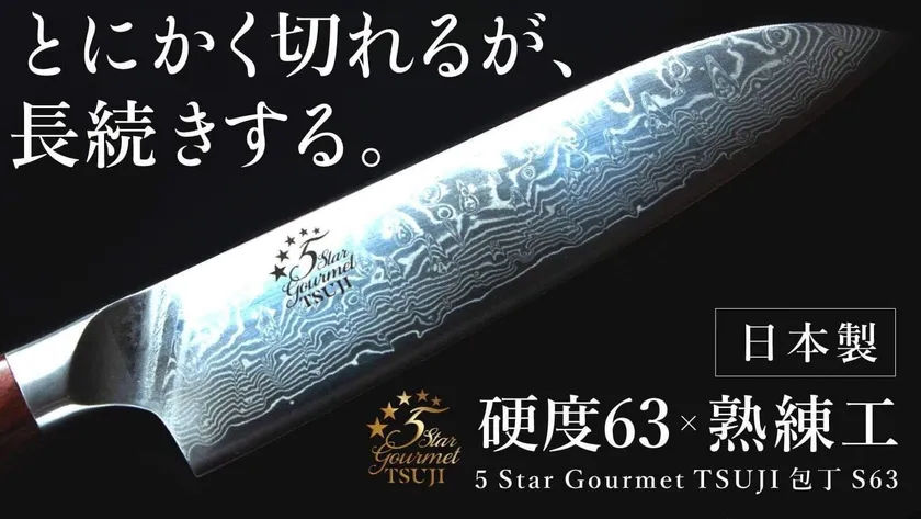 そこで、約10年で30本以上の包丁を使ってきた「5 Star Gourmet TSUJI」は一生続く鋭い切れ味を、高級鋼材SLD鋼(硬度63)と研ぎの技術で実現した長く切れ味を保ち、使いやすくて料理の腕があがる包丁をプロデュースしました。また、辻シェフのプロデュースにより重さや長さにこだわった使いやすさ抜群の包丁は、600年の歴史ある堺の包丁職人が、月間200本限定生産で1本ずつ手作りしています。さらに実用性の高いデザインと耐水性に優れた持ち心地が良い天然ローズウッドのハンドルで衛生面と耐久性の両立を実現しいつまでも使って頂ける包丁となっています。