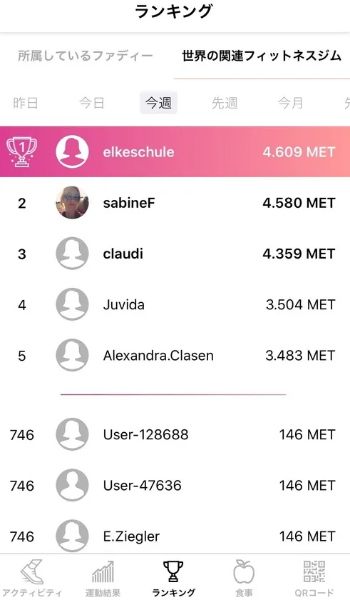 本アプリでは、自分の運動履歴に基づいたスコアが、海外の系列店舗も含めリアルタイムでランキングに表示され、世界中のフィットネスユーザーと競い合うことができます。