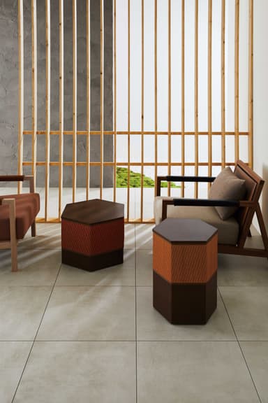 い草の繊維の六角形構造を模したデザイン。異なるサイズを組み合わせることで、自然界に見られる柱状節理、あるいは鉱物の結晶を想起させる造形表現が魅力です。