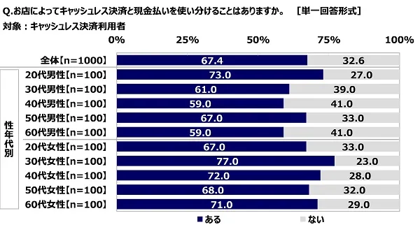 キャッシュレス決済利用者(1,000名)に、お店によってキャッシュレス決済と現金払いを使い分けることがあるか聞いたところ、「ある」は67.4%、「ない」は32.6%となりました。キャッシュレス決済利用者の多くは、利用するお店によって、決済方法を使い分けているようです。
