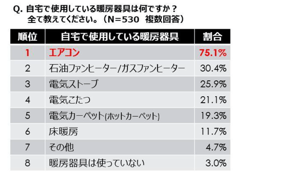 冬に使用する暖房器具には様々なものがありますが、自宅で使用している暖房器具を聞いたところ、75.1%の人が「エアコン」と回答しました。