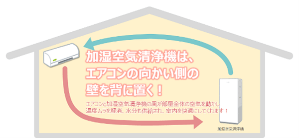 暖かい空気は上昇する性質があるため、室内の天井側と床側には温度ムラができやすくなります。一般的にエアコンの温度センサーは室内機にあり、天井側の空気が設定温度に到達すると、床側がまだ暖かくなっていなくても運転を弱めてしまいます。こうした場合にエアコンの設定温度を上げて床側を暖めようとすると、その分、消費電力が増加します。空気清浄機、サーキュレーター、扇風機などで天井と床の空気を撹拌し、温度ムラを抑えましょう。特に加湿空気清浄機を使用すれば、空気の撹拌と加湿、空気清浄を同時にできるので一石二鳥です。