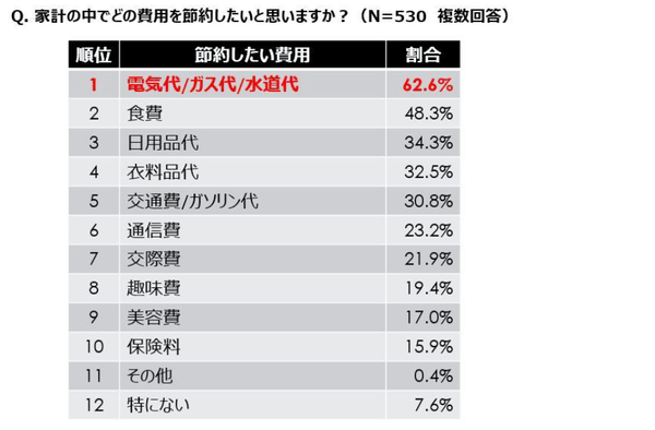節約したい費用、第1位は「電気代/ガス代/水道代」 「食費」以上の節約ニーズがあることが判明