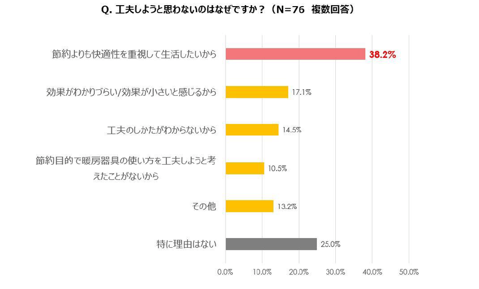 一方で、「工夫しようと思わない」(14.8%)と答えた人に対し、その理由を聞いたところ、「節約よりも快適性を重視して生活したいから」(38.2%)が最も多い理由で、次いで「効果がわかりづらい/効果が小さいと感じるから」(17.1%)、「工夫のしかたがわからないから」(14.5%)という回答が挙がりました。