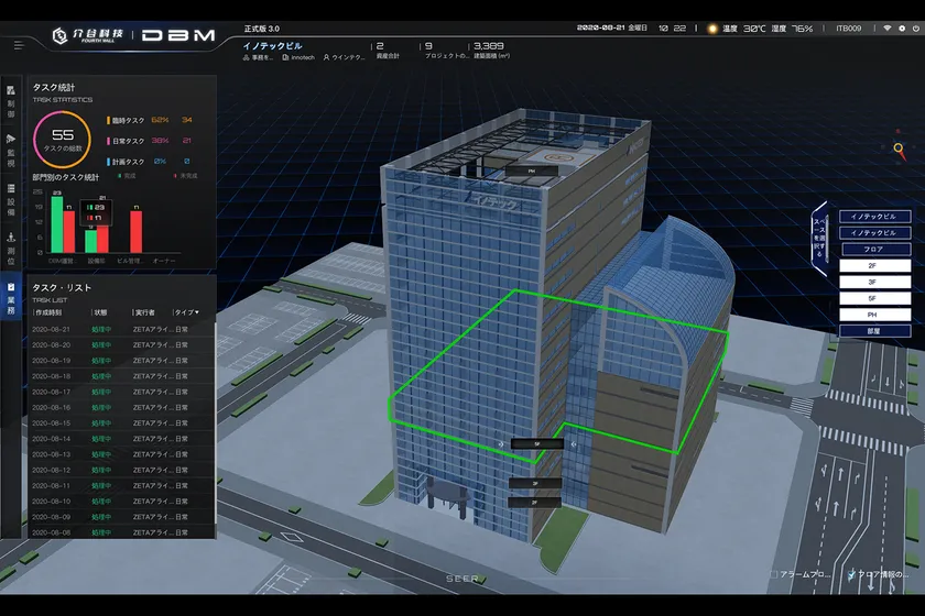 DBMはタスク管理システム、テナント管理システム、機器資産管理システム、3D空間可視化プラットフォームで構成されており、建物空間および建物内の人員、設備、テナント、および環境などすべての情報を可視化するクラウドベースのビルディング・マネジメント・システムです。