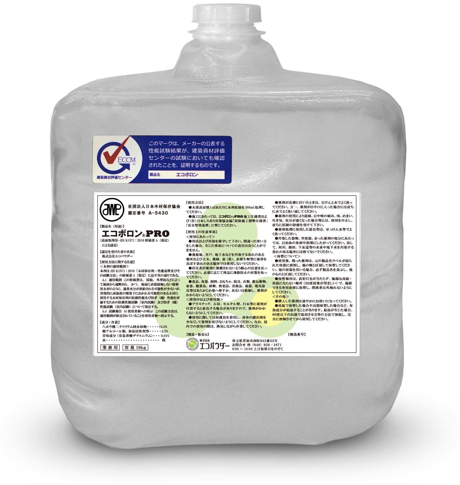 エコボロンシリーズは安全性の高い無機物「ホウ酸塩」を有効成分とする防腐防蟻剤。「ホウ酸塩」は揮発蒸発しないため室内の空気を一切汚すことがなく、乳幼児や妊婦さんのいるご家庭でも安心してお使いいただけます。さらに、小さなお子様等による万が一の誤飲事故を防止するため、苦味を配合。安全性向上にこだわっています。