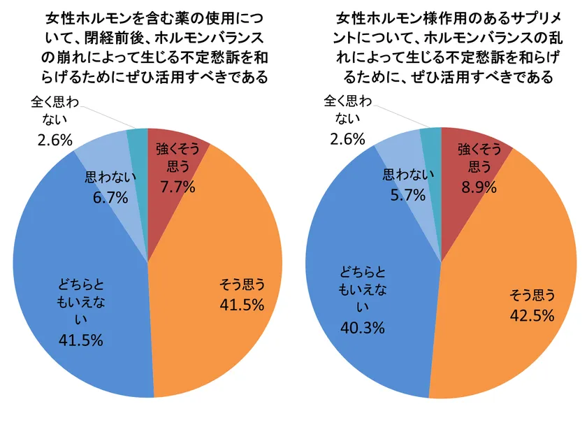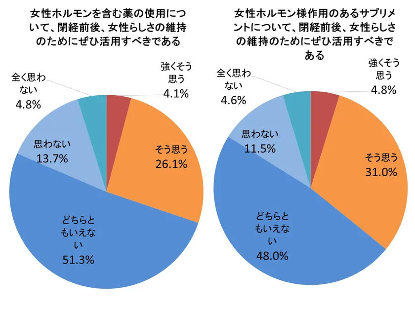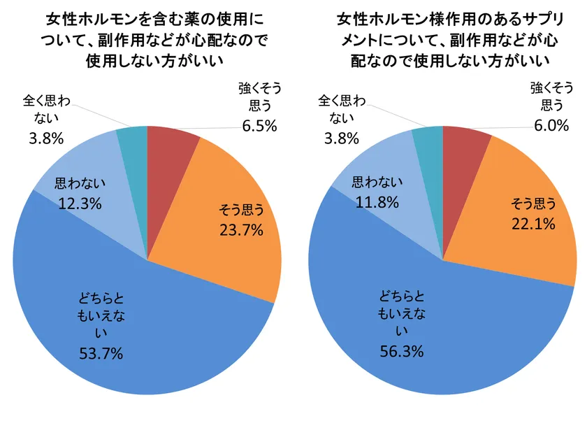 一方、女性ホルモン様作用のあるサプリメントの使用についての同様の質問では、「強くそう思う」が4.8%、「そう思う」が31.0%、「思わない」が11.5%、「全く思わない」が4.6%でした。