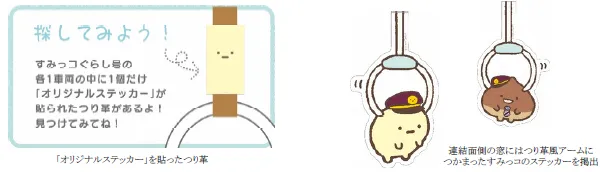 また車内では、すみっコたちが「くり駅長」と出会い、おいしいものを探して阪急沿線をめぐる物語を中吊りポスターで展開するほか、すみっコたちが車内でのマナーの向上を呼びかけるステッカーを掲出します。