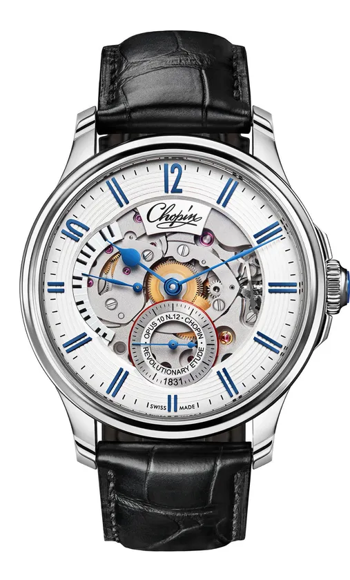 2019年4月26日、特別なタイムピース「ショパンOp.10 No.12」が、ワルシャワのフリデリク・ショパン博物館で初公開されました。ショパンの豊かな遺産に深く魅了され設立された新しいブランドの背後にいるクリエイターのミッションは、偉大な作曲家の時空を超えた遺産と、現代のウォッチメイキング、洗練されたデザインを融合させることでした。Chopin(ショパン)ブランドのファーストモデルの主なモチーフは、エチュードハ短調Op.10 No.12です。もう一つの言い方をすると、ショパンのエチュード(練習曲)作品番号10 第12番「革命」です。