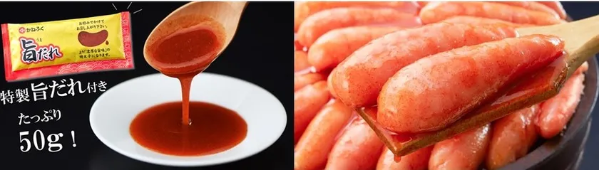 かねふくの“じっくり二度漬け”の樽仕込み工程に加え、新たに旨だれを別添いたしました。旨だれは、そのままでも美味しい『できたて明太子』に加えると、更に濃厚な味わいとなります。お好みで適量かけてお召し上がりください。
