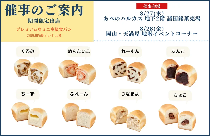 高級食パン専門店『EIGHT BREAD PREMIUM』(本社:大阪市中央区)は、8月27日(木)に「あべのハルカス」、8月28日(金)に「岡山・天満屋」にて1日のみの限定で高級食パンの出店販売を行います。