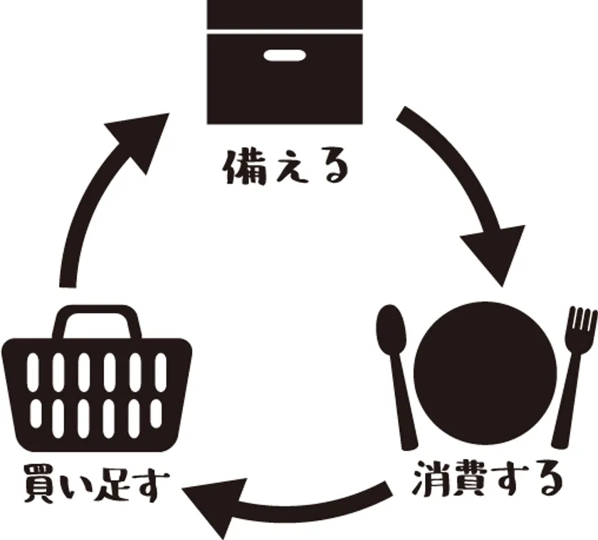 普段の食品を少し多めに買い置きしておき、賞味期限を考えて古いものから消費し、消費した分を買い足すことで、常に一定量の食品が家庭で備蓄されている状態を保つための方法。