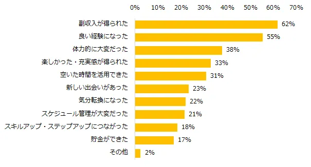 経験者に副業・ダブルワークをした理由を伺ったところ、「副収入が必要だから」(64%)が圧倒的多数を占めました。副業・ダブルワークを経験した感想でも「副収入が得られた」(62%)が最多となっており、当初の目的を達成できた方が多いようです。
