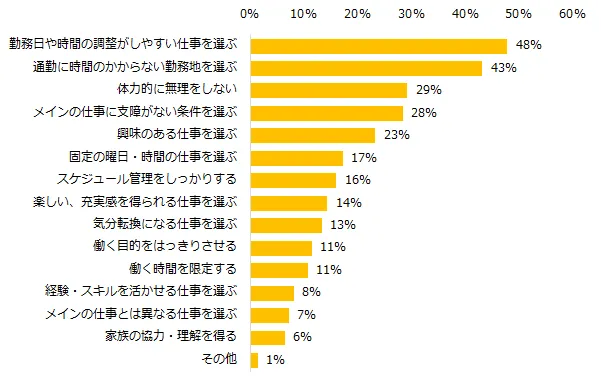 副業・ダブルワークを成功させるポイントを伺いました。トップ3は「勤務日や時間の調整がしやすい仕事を選ぶ」(48%)、「通勤に時間のかからない勤務地を選ぶ」(43%)、「体力的に無理をしない」(29%)でした。働き方や仕事内容など考慮し、慎重に副業を始める必要があるようです。