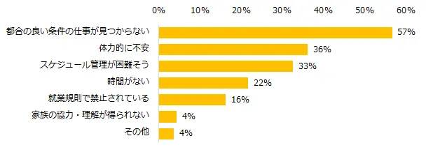「副業・ダブルワークをしたことはないが興味はある」と回答した方に、興味がある理由を伺ったところ、「貯金をしたいから」(57%)、「副収入が必要だから」(46%)、「空いた時間の活用」(43%)が上位に挙げられました。金銭的な目的で副業に関心を寄せている方が多いようです。また、興味はあるが実際にしたことがない理由については、半数以上の方が「都合の良い条件の仕事が見つからない」(57%)を挙げています。