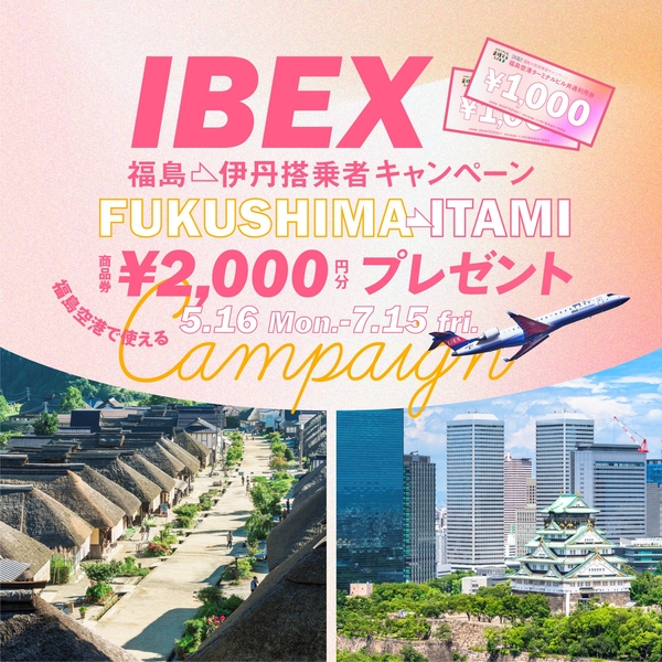 対象期間中、IBEX80便もしくは82便(福島⇒大阪(伊丹)線)ご搭乗の方へ【福島空港対象店舗で使用可能なクーポン券(2,000円)】をお渡しします