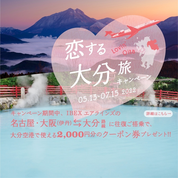 対象期間中、IBEX大分=大阪(伊丹)線/大分=名古屋(中部)線を往復でご搭乗の方へ【大分空港対象店舗で使用可能なクーポン券(2,000円分)】をお渡しします