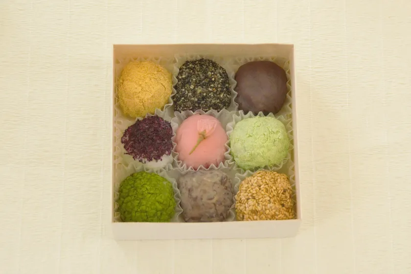 (こし餡、あずき糀つぶ餡、黄な粉、黒胡麻、金ゴマ、赤しそ、