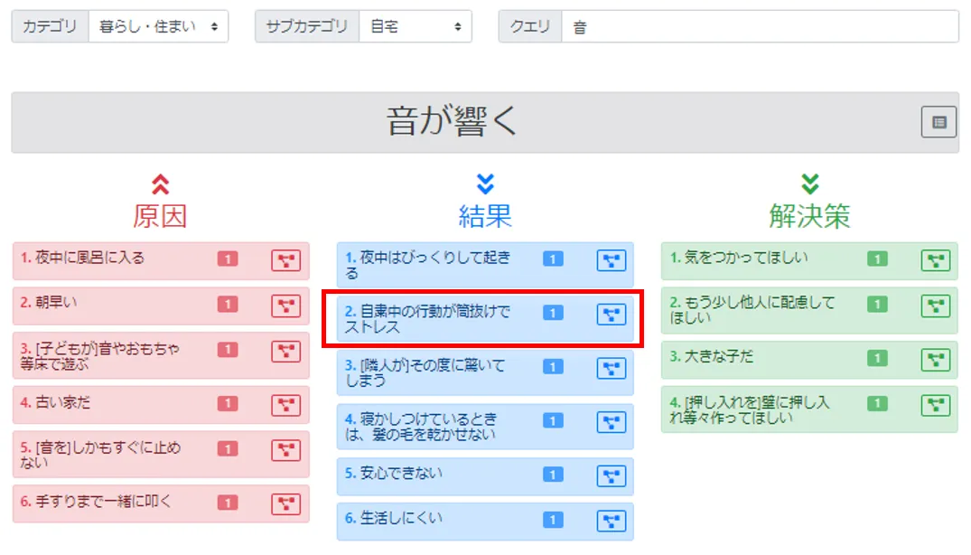 例えば、「音が響く」という不満のまとまりに対する原因、結果、解決策のうち、自動抽出された「結果」の1つとして「自粛中の行動が筒抜けでストレス」があります。この原文を参照することで以下のようなインサイト探索が可能となります。