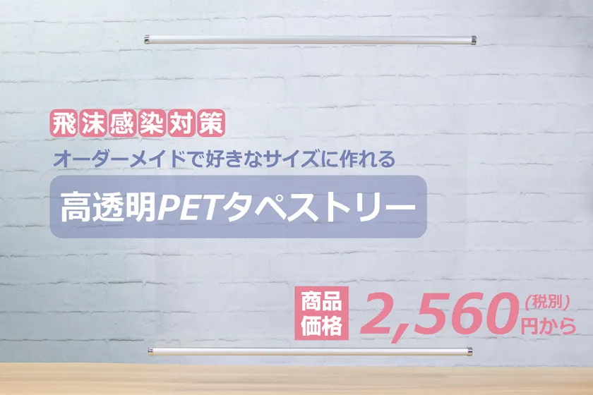 大型出力専門店MakuMakuにて5月より販売しております高透明PETタペストリーは、一定の硬さと安定感があるPET素材で作るオーダーメイドで制作する飛沫感染対策用のタペストリーです。