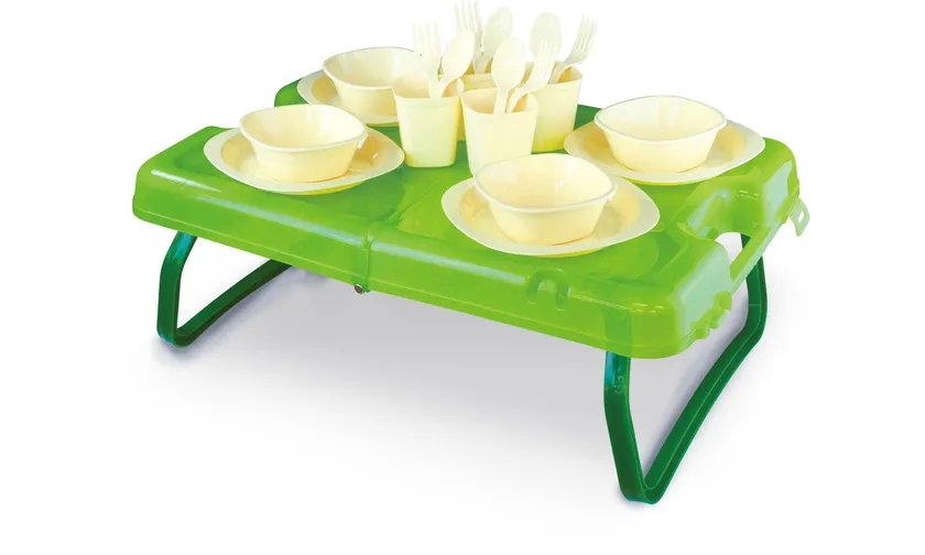 特徴 :コップ・プレート・ボウル・スプーン・フォークが4人分付属します。収納ケースがテーブルとしても使用できます。