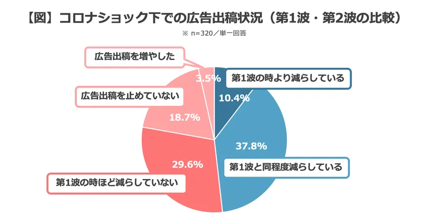 新型コロナウイルス感染拡大の第2波を受け、第1波と比較して広告出稿の制限を緩和している企業が過半数に達し、第1波よりも広告出稿を減らしたと回答した企業は10.4%にとどまった。
