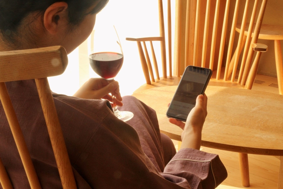 界 松本スタッフがオリジナルで制作した地元のワイナリーを案内する動画を客室にいながら、自分のスマホを使ってオンラインで視聴し、まるでワイナリー巡りをするような気分の中で、スタッフ一押しのワインをテイスティングするブログラムです。各地に点在するワイナリーに、車で足を運ぶと、運転手は試飲ができず我慢をすることがありますが、温泉旅館に泊まることで、その後の移動を気にせず味わうことができます。