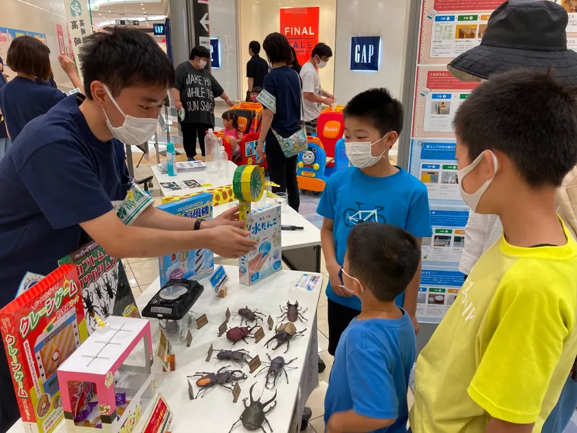 2020年8月に実施されたイベントは、幼稚園児から小学校高学年の子どもまでをメインターゲットとした「夏休みの自由研究inイオン」。こちらは、同年代の子供同士が家族も含めてコミュニケーションを取りながら、大学生の助けを借りて夏休みの宿題である「自由研究」に取り組むというものです。イオンモール高崎内の未来屋書店とも連携をし、工作キット紹介ブースと自由研究のまとめ方コーナーも設置しました。2019年の12月より半年を掛けて取り組んできた企画であり、イオンが掲げる「ハピネスモール」の方針にも合致する内容でした。