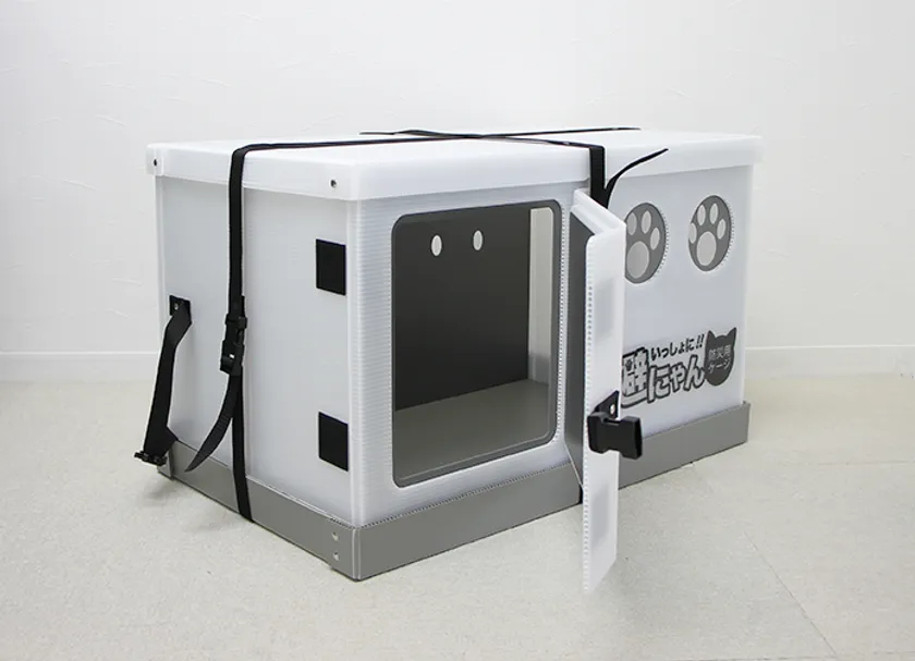 避難所情報にあるように、各避難所にケージの備蓄はありません。大事なペットと安心して同行避難をするための一助となるべく、軽くて折り畳みが出来、工具も使わず簡単に組み立てられる。水が使えない災害時に汚れも簡単に拭き取れ、トイレも置けるスペースがあるケージ“いっしょに避にゃん”を企画・開発しました。