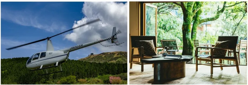 深緑に囲まれた部屋(右)と箱根へ向かうヘリコプター(左)