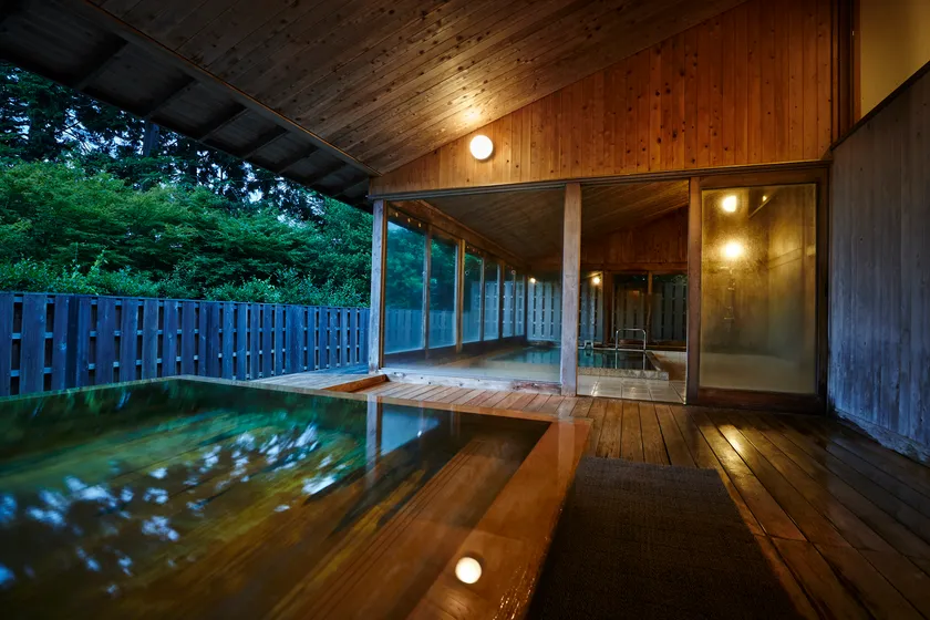 森の中の全長200メートルのウッドデッキを歩くと、箱根の深い緑に包まれまるで森の一部になったかのように感じる宿泊者限定の総檜の浴室の天然温泉「onsen f」があり、大きく開放された窓から四季折々の景色をお楽しみいただけます。