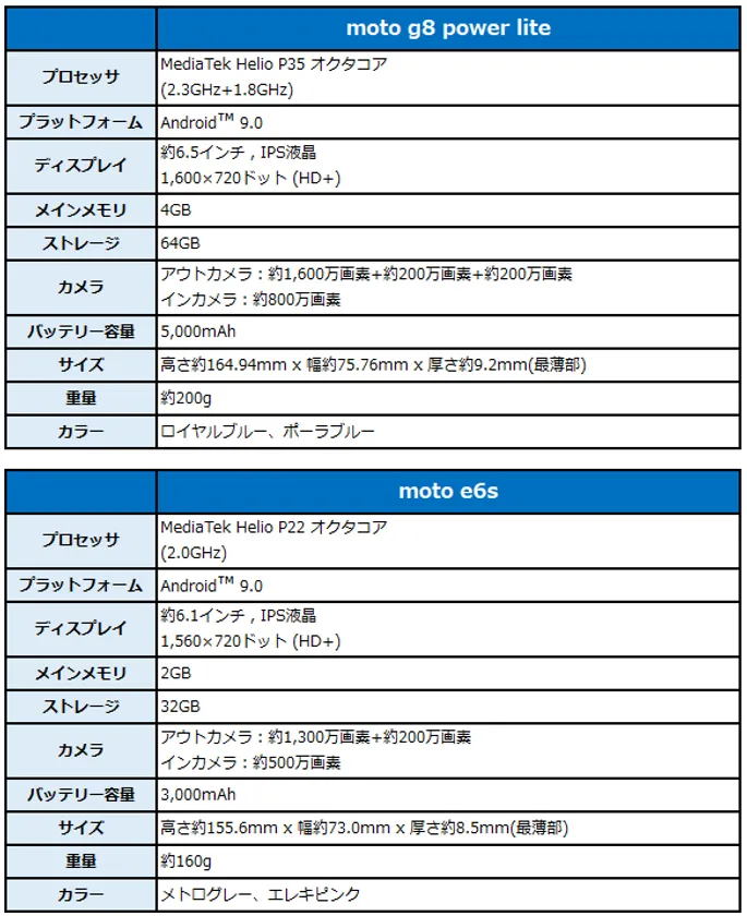 ビッグローブ株式会社(本社:東京都品川区、代表取締役社長:有泉 健、以下 BIGLOBE)は、モバイルサービス「BIGLOBEモバイル」において、Motorola製スマートフォン「moto g8 power lite」と「moto e6s」の提供を本日9月4日より開始します。