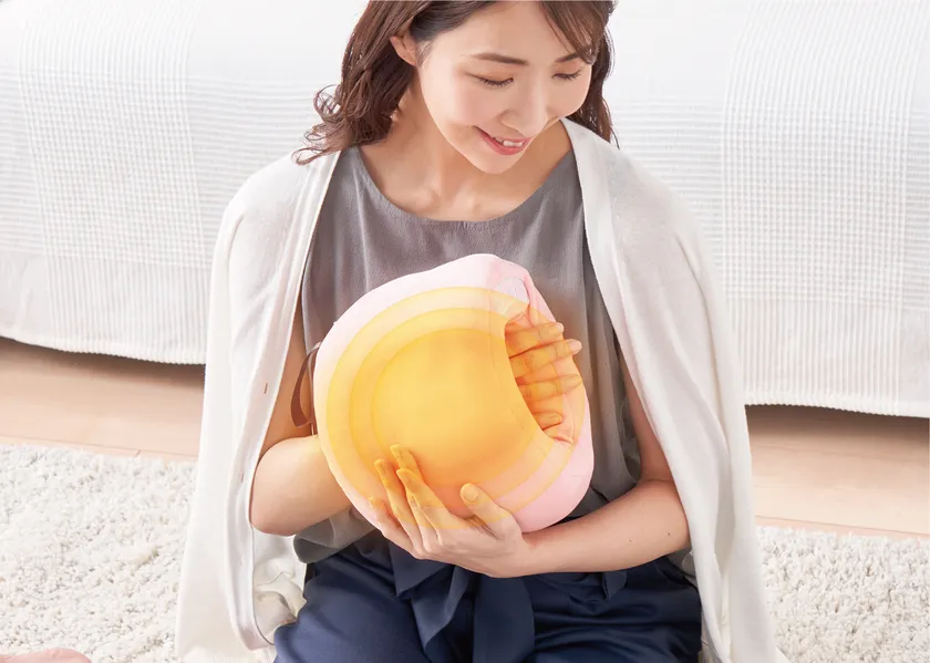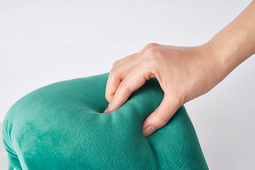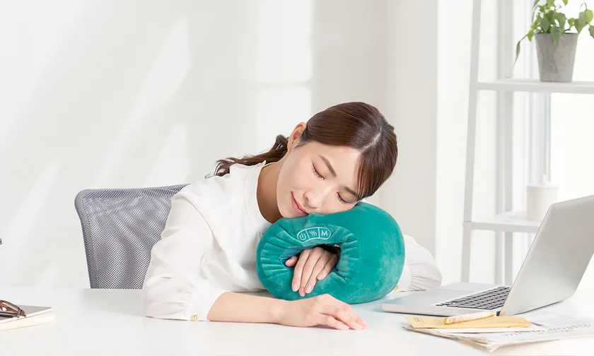 仕事や家事のすきま時間に、お昼寝用枕としてもご使用いただける「マイアームケア」は、顔に型や跡が残らない柔らかく肌ざわりの良い生地を採用し、ふわふわでモチモチとした心地よさを感じていただけます。触るだけでも癒されるような上質な柔らかさにこだわりました。