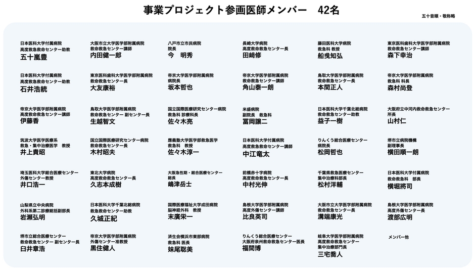 本事業は、3ヵ年10億円をかけた事業となり、ジョリーグッドを中心に、各種制度や指針の環境構築の監修に日本医科大学付属病院を始め、日本救急医学会、日本外傷学会、日本外傷診療研究機構の3学会と提携し、全国から専門医など42名をむかえ、「VR遠隔臨床学習プラットフォーム」の完成を目指します。