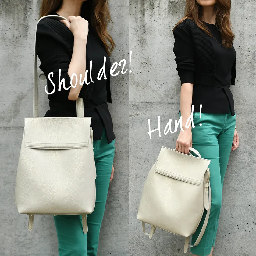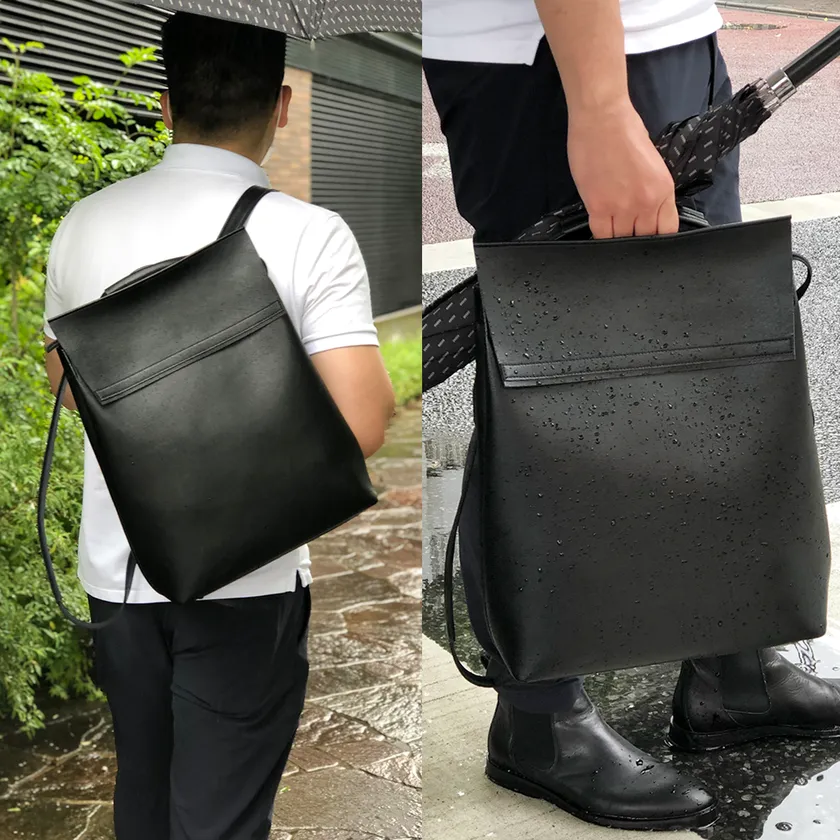 高級車の内装で使用されている高品質な日本製「人工皮革」を使用することにより、軽さと耐久性、耐水性、そしてデザイン性を実現させたユニセックス・リュック。エシカルと実用性を兼ね備えたメイド・イン・ジャパンのバッグは、あらゆるシーンで活躍するベーシックなデザインです。一瞬で簡単にショルダーに変身し、ハンド、斜め掛けなど自由に使えます。ストラップは6段階に長さ調整可能。6つの底鋲がしっかりとバッグを支え、床置きも可能です。
