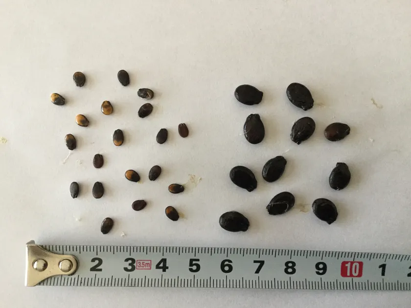 種子サイズの比較。写真左:新品種「ピノ・ガール」種子/右:従来の小玉西瓜の種子
